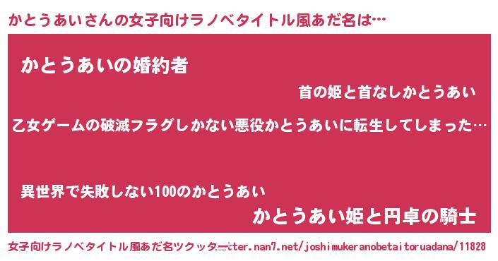 | 男性向けラノベタイトル風あだ名 | 『魔弾の王とかとうあい』 |