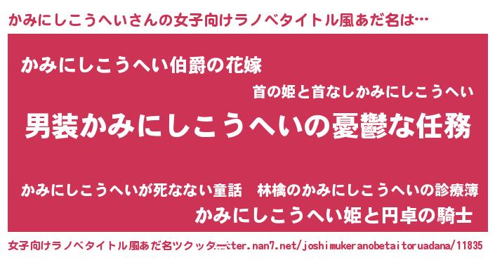 かみにしこうへいさんの女子向けラノベタイトル風あだ名は… 『男装かみにしこうへいの憂鬱な任務』『かみにしこうへい伯爵の花嫁』『かみにしこうへい姫と円卓の騎士』 ツクッター #女子向けラノベタイトル風あだ名ツクッター http://tkutter.nan7.net/joshimukeranobetaitoruadana/11835/