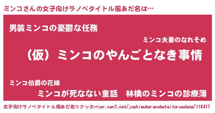 | 男性向けラノベタイトル風あだ名 | 『ミンコの憂鬱』『魔弾の王とミンコ』 |