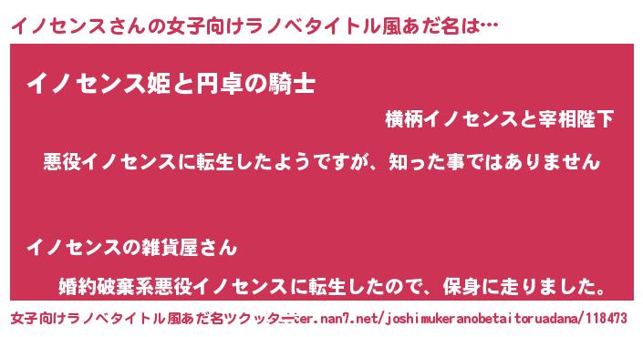 | 男性向けラノベタイトル風あだ名 | 『この素晴らしい世界にイノセンスを!』 |