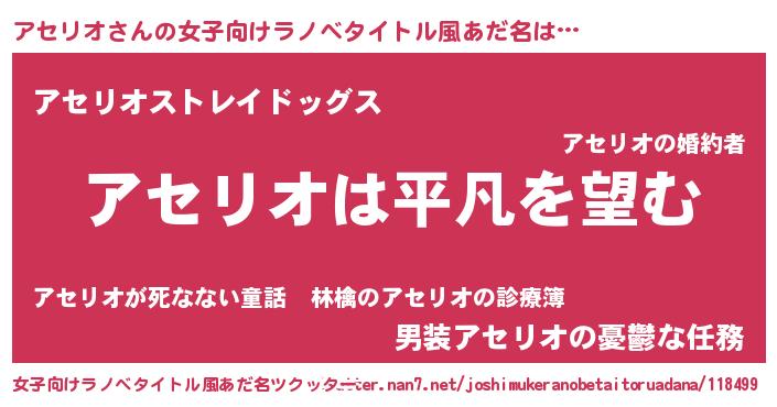 | 胡散臭い通販商品みたいなあだ名 | 『信頼と実績のサプリメント…その名も「アセリオ」』 |