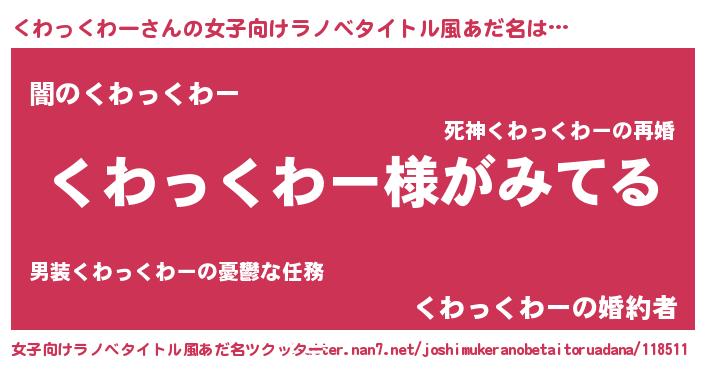 | 男性向けラノベタイトル風あだ名 | 『くわっくわーの嫁は女の子じゃないと思った?』 |