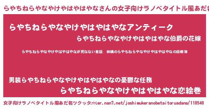| 男性向けラノベタイトル風あだ名 | 『魔弾の王とらやちねらやなやけやはやはやな』 |