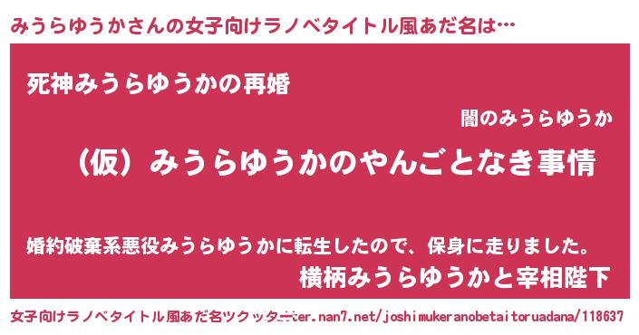 みうらゆうかさんの女子向けラノベタイトル風あだ名は… 『(仮)みうらゆうかのやんごとなき事情』『死神みうらゆうかの再婚』『横柄みうらゆうかと宰相陛下』 ツクッター #女子向けラノベタイトル風あだ名ツクッター http://tkutter.nan7.net/joshimukeranobetaitoruadana/118637/