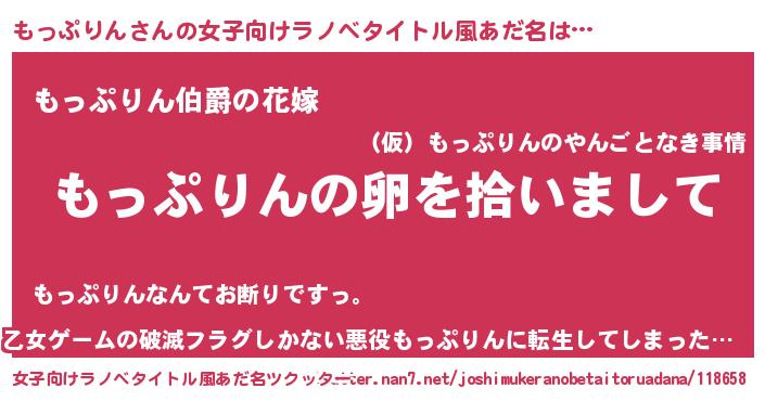 | 男性向けラノベタイトル風あだ名 | 『もっぷりんの嫁は女の子じゃないと思った?』 |