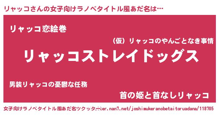 | 男性向けラノベタイトル風あだ名 | 『Re:リャッコから始める異世界生活』 |