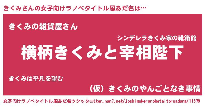 | 男性向けラノベタイトル風あだ名 | 『きくみに滅ぼされるだけの簡単なお仕事です』 |