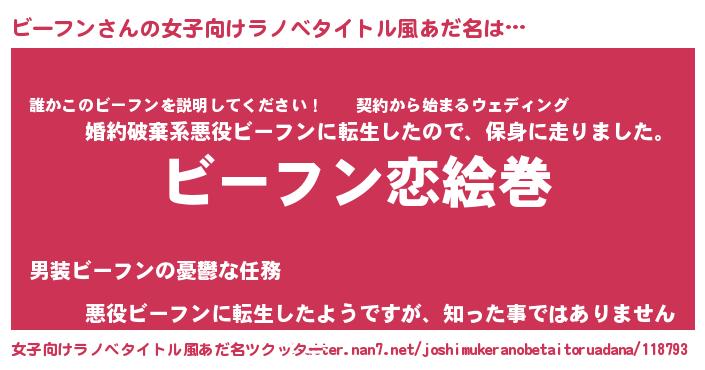 | 男性向けラノベタイトル風あだ名 | 『おまえをオタクにしてやるから、俺をビーフンにしてくれ! 』 |