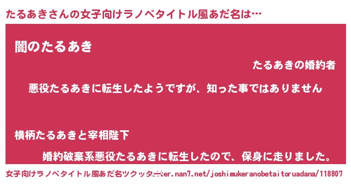 | 男性向けラノベタイトル風あだ名 | 『この素晴らしい世界にたるあきを!』 |