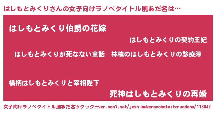 はしもとみくりさんの女子向けラノベタイトル風あだ名は… 『はしもとみくりが死なない童話 林檎のはしもとみくりの診療簿』『はしもとみくり伯爵の花嫁』『死神はしもとみくりの再婚』 ツクッター #女子向けラノベタイトル風あだ名ツクッター http://tkutter.nan7.net/joshimukeranobetaitoruadana/118842/