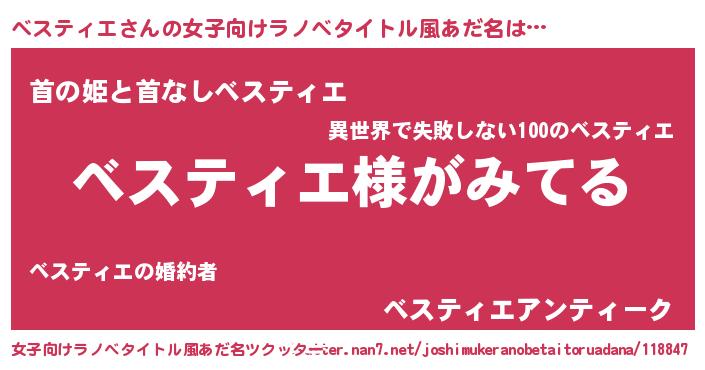 | 男性向けラノベタイトル風あだ名 | 『ベスティエの嫁は女の子じゃないと思った?』 |