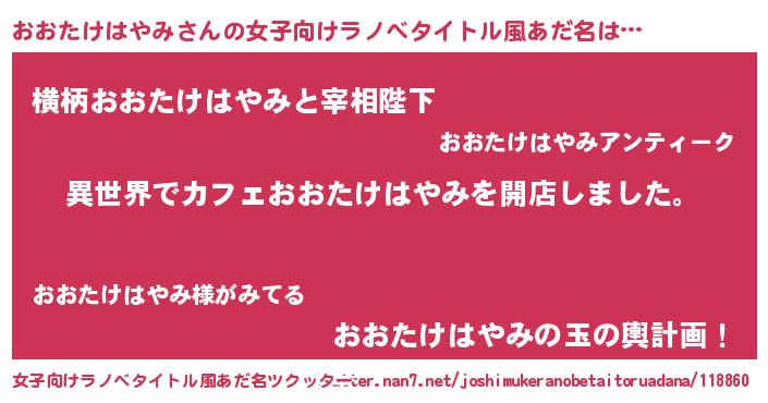 おおたけはやみさんの女子向けラノベタイトル風あだ名は… 『異世界でカフェおおたけはやみを開店しました。』『横柄おおたけはやみと宰相陛下』『おおたけはやみの玉の輿計画!』 ツクッター #女子向けラノベタイトル風あだ名ツクッター http://tkutter.nan7.net/joshimukeranobetaitoruadana/118860/