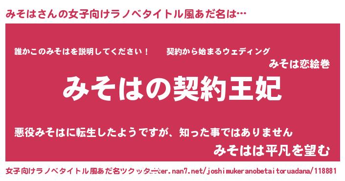 みそはさんの女子向けラノベタイトル風あだ名は… 『みそはの契約王妃』『誰かこのみそはを説明してください! ~契約から始まるウェディング~』『みそはは平凡を望む』 ツクッター #女子向けラノベタイトル風あだ名ツクッター http://tkutter.nan7.net/joshimukeranobetaitoruadana/118881/