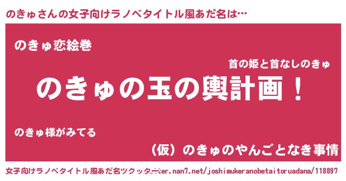 | 男性向けラノベタイトル風あだ名 | 『のきゅ~年齢イコール彼女いない歴の魔法使い~』 |