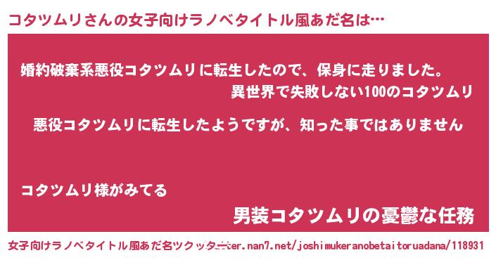 | 男性向けラノベタイトル風あだ名 | 『この素晴らしい世界にコタツムリを!』 |