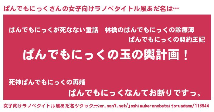 | 男性向けラノベタイトル風あだ名 | 『転生したらぱんでもにっくだった件』 |