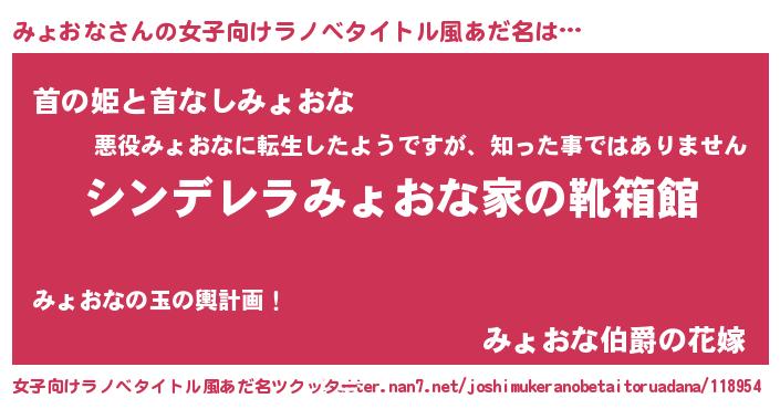 みょおなさんの女子向けラノベタイトル風あだ名は… 『シンデレラみょおな家の靴箱館』『首の姫と首なしみょおな』『みょおな伯爵の花嫁』 ツクッター #女子向けラノベタイトル風あだ名ツクッター http://tkutter.nan7.net/joshimukeranobetaitoruadana/118954/