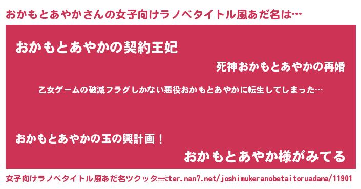 | 男性向けラノベタイトル風あだ名 | 『この素晴らしい世界におかもとあやかを!』 |