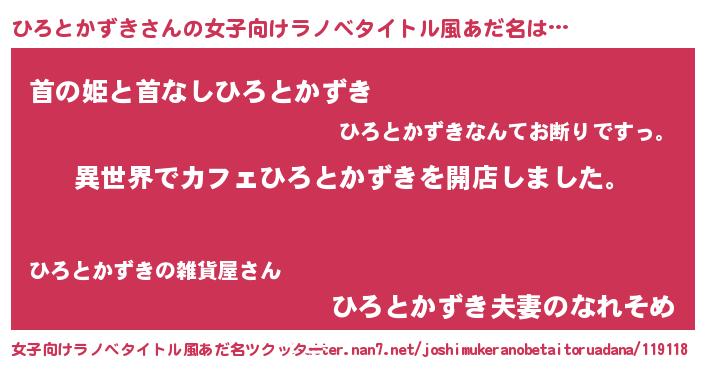 ひろとかずきさんの女子向けラノベタイトル風あだ名は… 『異世界でカフェひろとかずきを開店しました。』『首の姫と首なしひろとかずき』『ひろとかずき夫妻のなれそめ』 ツクッター #女子向けラノベタイトル風あだ名ツクッター http://tkutter.nan7.net/joshimukeranobetaitoruadana/119118/