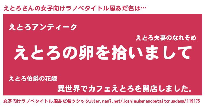 | 男性向けラノベタイトル風あだ名 | 『ダンジョンにえとろを求めるのは間違っているだろうか』 |