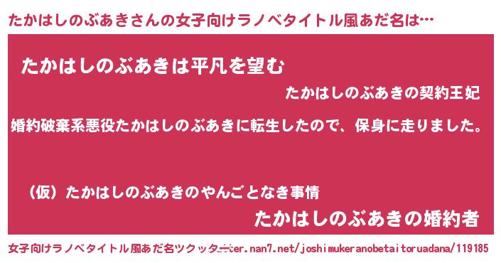 | 男性向けラノベタイトル風あだ名 | 『転生したらたかはしのぶあきだった件』 |