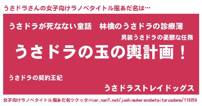 | 男性向けラノベタイトル風あだ名 | 『うさドラ~年齢イコール彼女いない歴の魔法使い~』 |