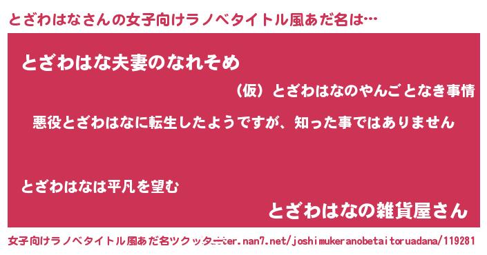 とざわはなさんの女子向けラノベタイトル風あだ名は… 『悪役とざわはなに転生したようですが、知った事ではありません』『とざわはな夫妻のなれそめ』『とざわはなの雑貨屋さん』 ツクッター #女子向けラノベタイトル風あだ名ツクッター http://tkutter.nan7.net/joshimukeranobetaitoruadana/119281/