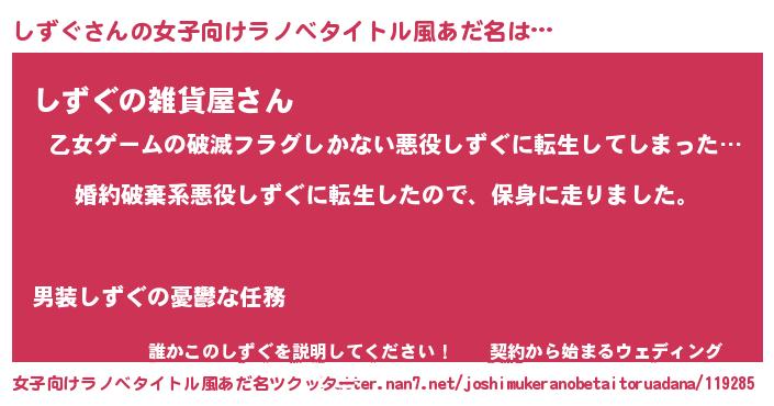 | 男性向けラノベタイトル風あだ名 | 『シズグスレイヤー』『魔弾の王としずぐ』 |