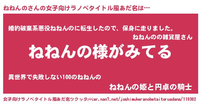| 男性向けラノベタイトル風あだ名 | 『ねねんのの嫁は女の子じゃないと思った?』 |