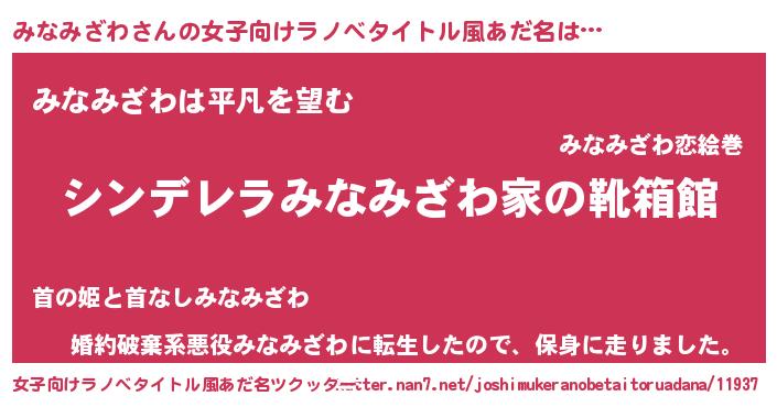 | 男性向けラノベタイトル風あだ名 | 『冴えないみなみざわの育てかた』 |