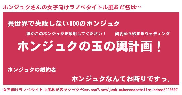 ホンジュクさんの女子向けラノベタイトル風あだ名は… 『ホンジュクの玉の輿計画!』『異世界で失敗しない100のホンジュク』『ホンジュクなんてお断りですっ。』 ツクッター #女子向けラノベタイトル風あだ名ツクッター http://tkutter.nan7.net/joshimukeranobetaitoruadana/119397/