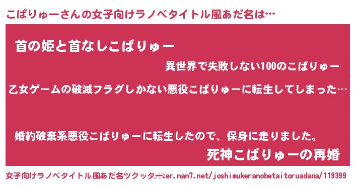 | 男性向けラノベタイトル風あだ名 | 『この素晴らしい世界にこばりゅーを!』 |
