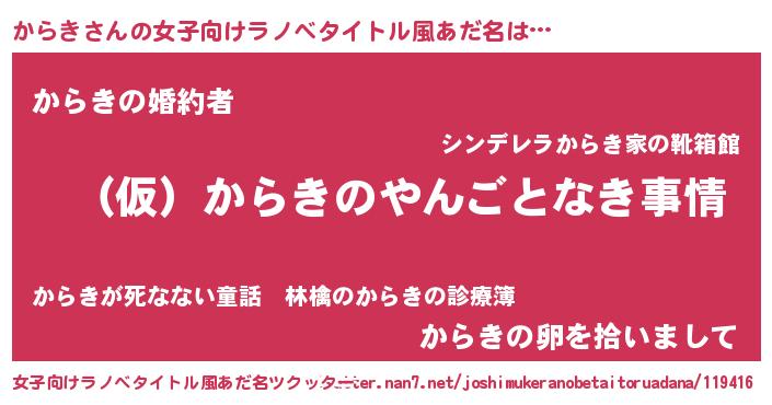| 男性向けラノベタイトル風あだ名 | 『からきの憂鬱』『魔弾の王とからき』 |
