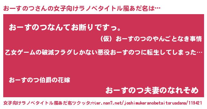 | 男性向けラノベタイトル風あだ名 | 『この素晴らしい世界におーすのつを!』 |