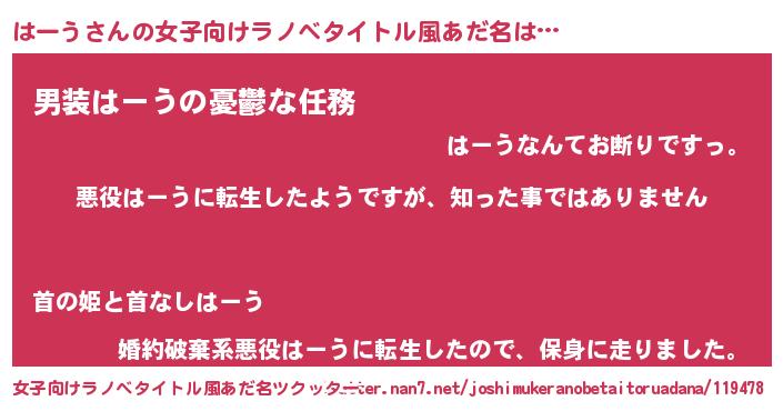| 男性向けラノベタイトル風あだ名 | 『この素晴らしい世界にはーうを!』 |