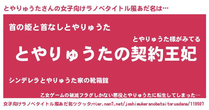 | 男性向けラノベタイトル風あだ名 | 『とやりゅうたという概念が存在しない退屈な世界 』 |
