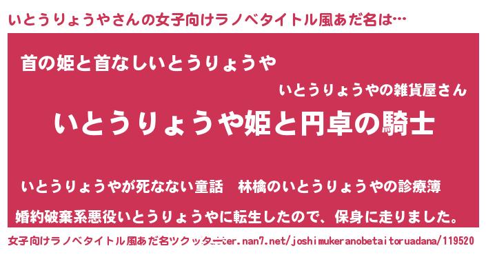 | 男性向けラノベタイトル風あだ名 | 『イトウリョウヤアートオンライン』 |