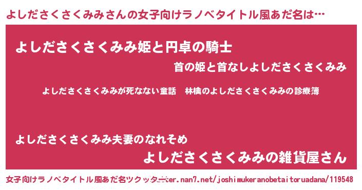 | 男性向けラノベタイトル風あだ名 | 『魔弾の王とよしださくさくみみ』 |