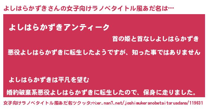 | 男性向けラノベタイトル風あだ名 | 『この素晴らしい世界によしはらかずきを!』 |