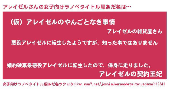 | 胡散臭い通販商品みたいなあだ名 | 『あなたにだけ特別に提供する100年もののヴィンテージワイン…その名も「アレイゼル」』 |