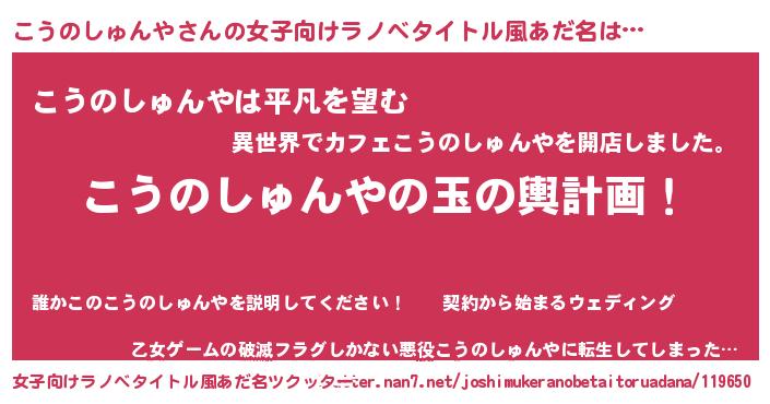 | 男性向けラノベタイトル風あだ名 | 『転生したらこうのしゅんやだった件』 |