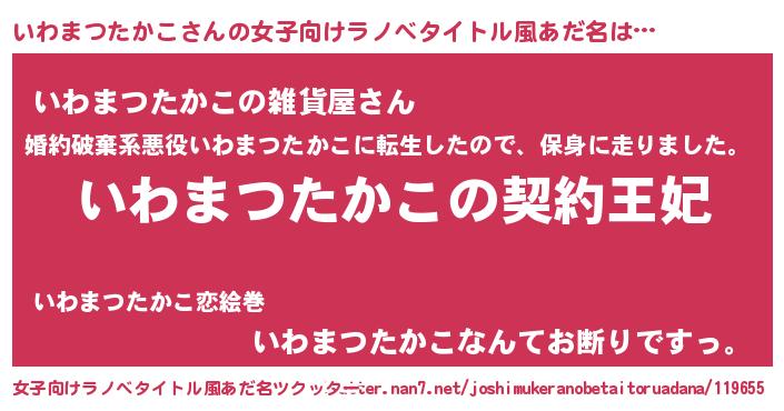 | 男性向けラノベタイトル風あだ名 | 『いわまつたかこという概念が存在しない退屈な世界 』 |
