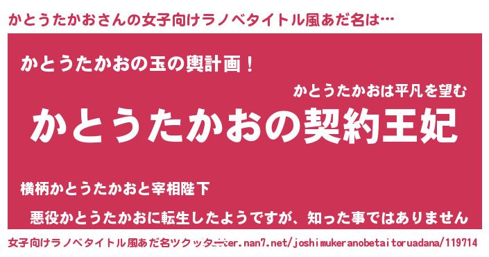 | 男性向けラノベタイトル風あだ名 | 『誰もが恐れるあのかとうたかおが、ぼくの専属メイドになるようです。』 |