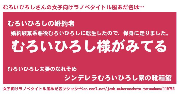 | 男性向けラノベタイトル風あだ名 | 『むろいひろしの嫁は女の子じゃないと思った?』 |