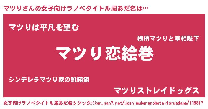| 男性向けラノベタイトル風あだ名 | 『おまえをオタクにしてやるから、俺をマツりにしてくれ! 』 |