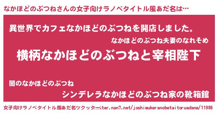 | 男性向けラノベタイトル風あだ名 | 『なかほどのぶつねに滅ぼされるだけの簡単なお仕事です』 |