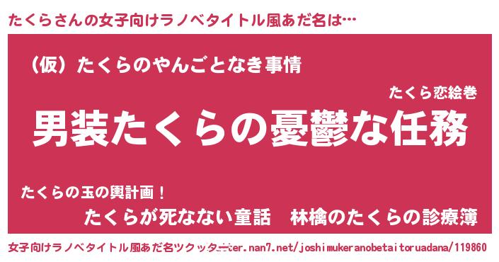 | 男性向けラノベタイトル風あだ名 | 『うちのたくらが世界を掌握している!』 |