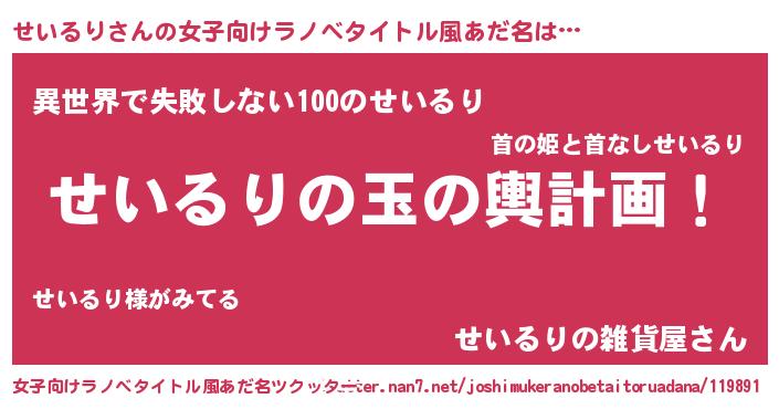 | 男性向けラノベタイトル風あだ名 | 『せいるり~年齢イコール彼女いない歴の魔法使い~』 |