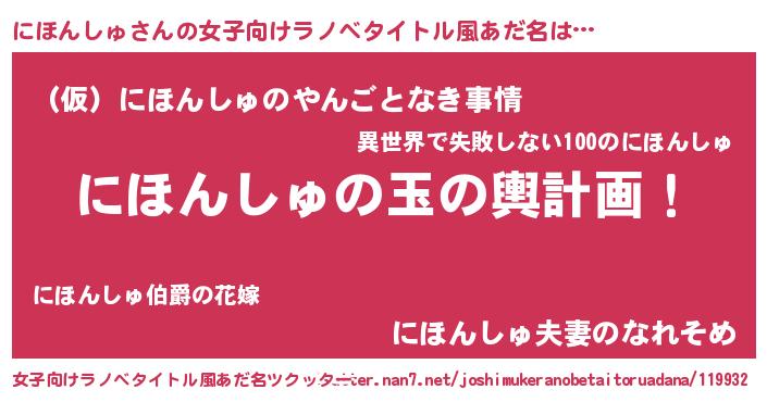 | 男性向けラノベタイトル風あだ名 | 『にほんしゅ~年齢イコール彼女いない歴の魔法使い~』 |