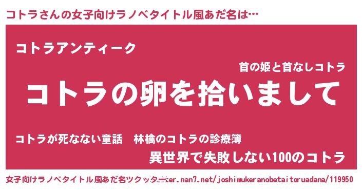 | 男性向けラノベタイトル風あだ名 | 『コトラの嫁は女の子じゃないと思った?』 |